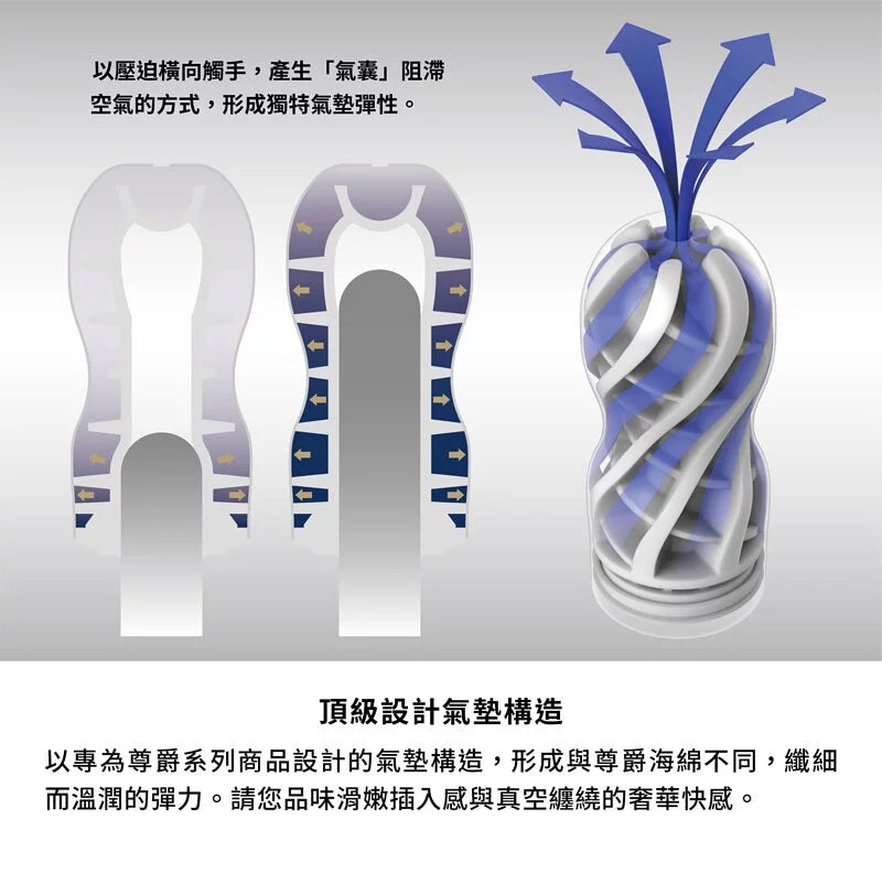 PREMIUM TENGA AIR CUSHION CUP 氣墊飛機杯 結構示意圖,以氣囊阻滯空氣產生彈性效果,創造柔滑刺激與真空吸附感。